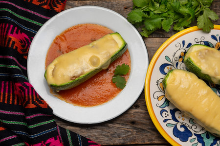 Traditional stuffed zucchini with tuna and melted cheese on wooden background