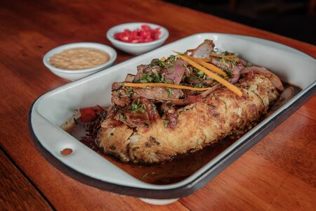 Quesadilla with beef barbecue and sauce. traditional mexican food