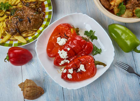 Lucene paprike , Peppers with GARLIC, Balkan cuisine cuisine, Traditional assorted dishes, Top view.