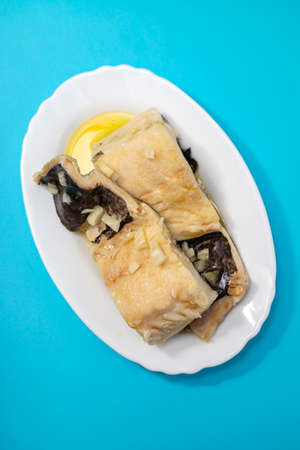 boiled cod fish with olive oil on white dish