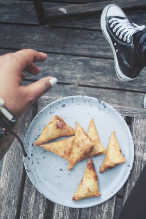 Selfie of samosa with hand