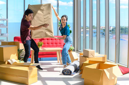 young asian couple smiling and enjoy when they carrying big cardboard box while relocation into new home on moving day, celebrating moving to new home concept