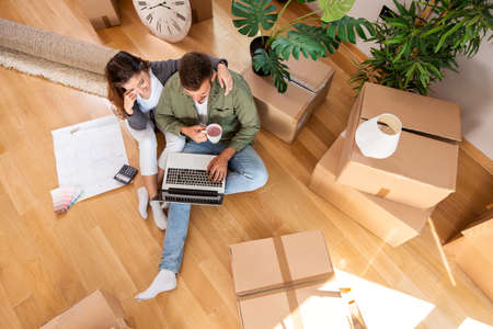 Caucasian woman with laptop planning design of new flat, couple in new apartment unpacking, moving and relocation