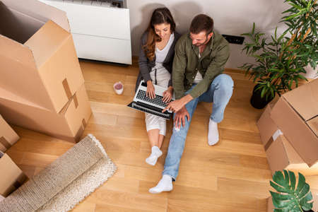 moving day - happy young couple sitting between boxes and using laptop