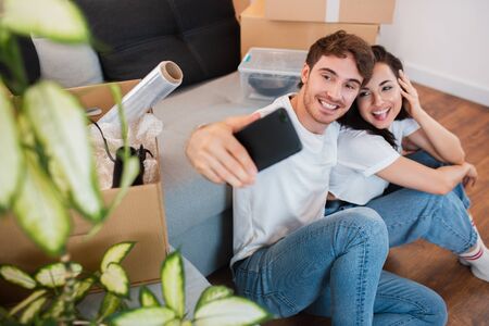young couple is moving, making selfie, smiling while sitting among cardboard boxes