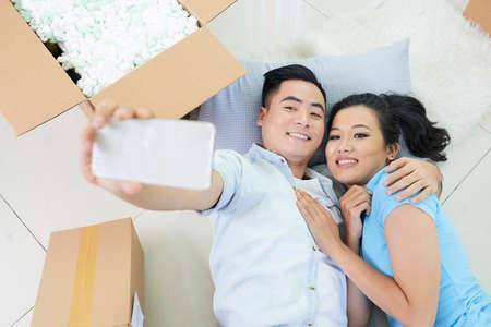 Young romantic Asian couple taking selfie while lying on floor in new apartment with carton boxes around