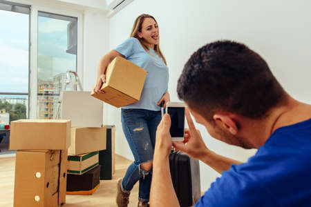 Guy picture his girlfriend while holding cardboard box in their new flat