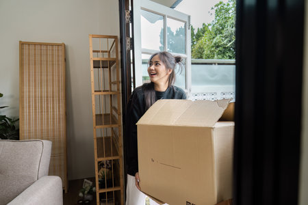 Young Woman Moving into New Home Carrying Cardboard Box with Excitement and Anticipation for Fresh Start and New Beginnings