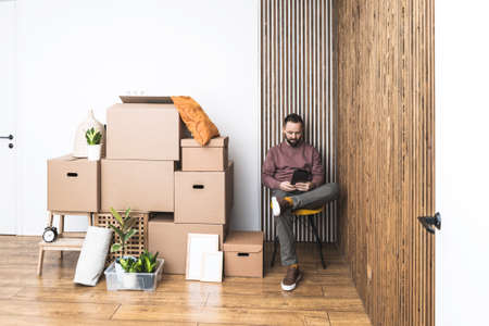 Mature man typing text message on his tablet, unpacking things from boxes while moving in new unfurnished apartment.