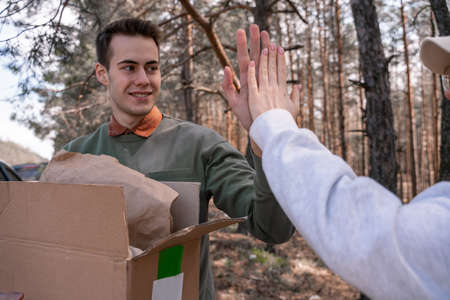 happy volunteer holding carton box and giving high five to woman