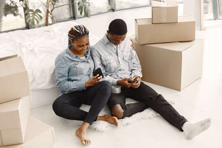 man using smartphone while sitting on stairs with girlfriend and carton boxes