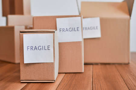 Cardboard boxes of different sizes with fragile labels