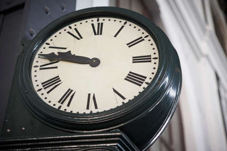 Close-up of Analog vintage white clock isolated on black background. Time management concept.