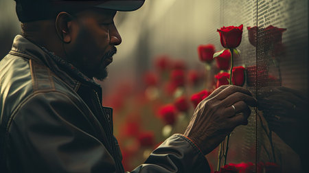 Man Touching Wall With Red Flowers in Peaceful Garden Landscape