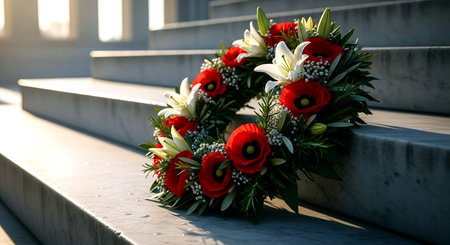 Red and white flowers in a wreath on the stairs of a military cemetery