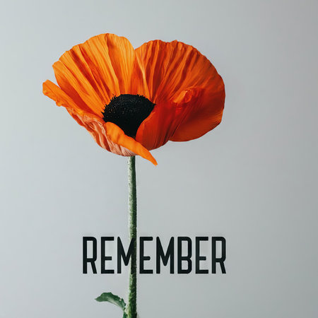 A tranquil cemetery scene at dusk featuring a weathered stone adorned with vibrant red poppies and a solemn memorial ribbon, evoking remembrance and s