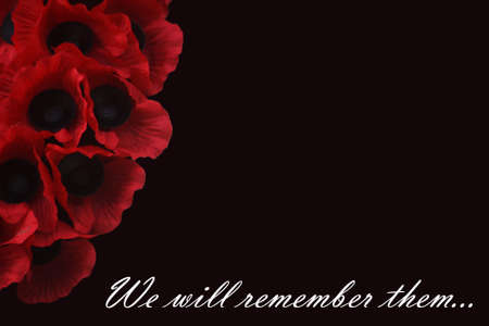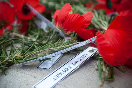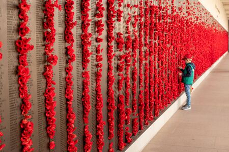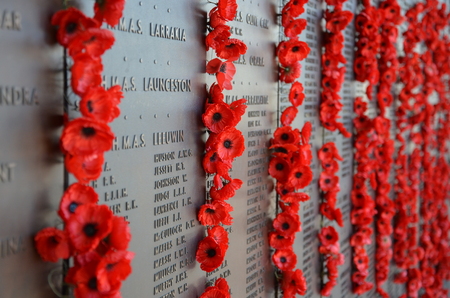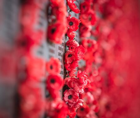 Canberra, ACT, Australia - Sept 1 2018: poppy decoration next to the wall of fallen soldiers at the Australian War Memorial - Lest we forget, Remembrance of war losses.