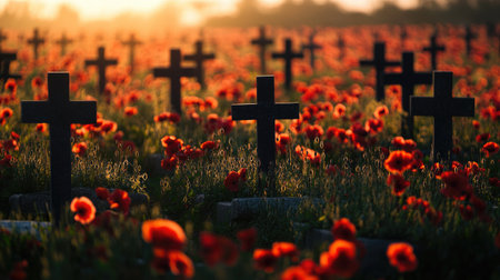 Crosses marking soldiers' graves stand amidst blooming poppies, representing the sacrifice and remembrance of fallen heroes.