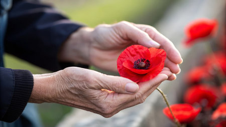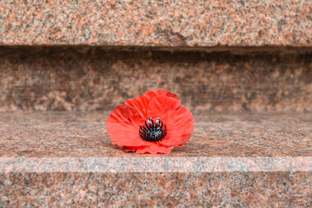 Hand placing red poppy flowers on war memorial on Remembrance Day in Ottawa, Canada