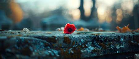A tranquil cemetery scene at dusk featuring a weathered stone adorned with vibrant red poppies and a solemn memorial ribbon, evoking remembrance and s