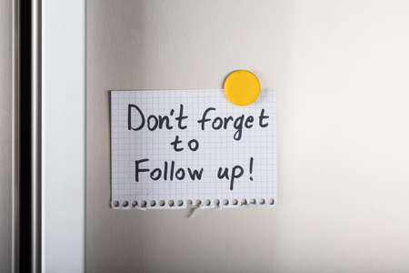 Closeup of don't forget to follow up note attached with yellow magnetic thumbtack on metal