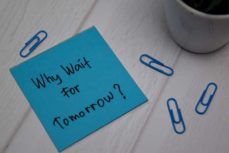 What Wait For Tomorrow write on sticky note isolated on wooden table.