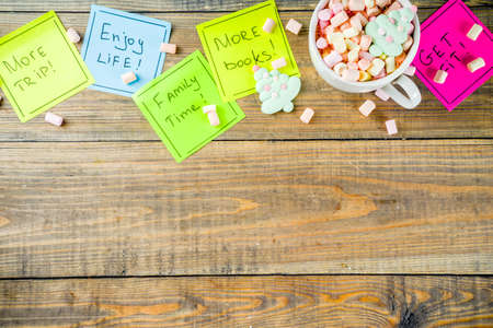 New years resolutions, colorful sticky notes with popular new year resolutions, wooden background with funny hot chocolate cup, copy space top view flatlay