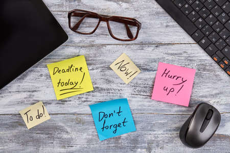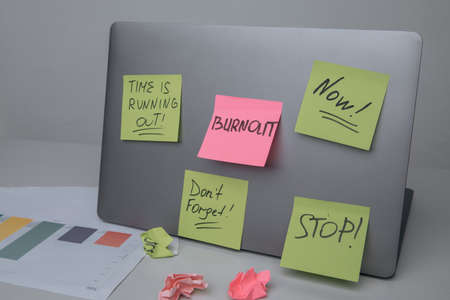Laptop, notes and clock on desk. Burnout concept