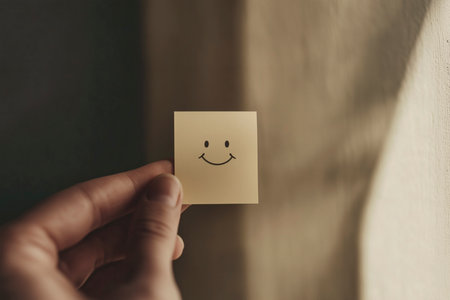 Close-up of a hand gently holding a square note featuring a simple hand-drawn smiley face.