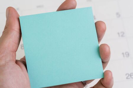 Hand holding blue sticky note or adhesive paper with copy space for writing message on white clean calendar using as reminder for vacation, project launch date or special event message.