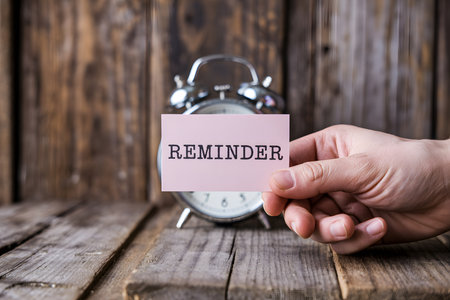 Close-up of a hand holding a light pink 'REMINDER' card against a rustic wooden background, complete with a softly blurred alarm clock for a warm, productive vibe.