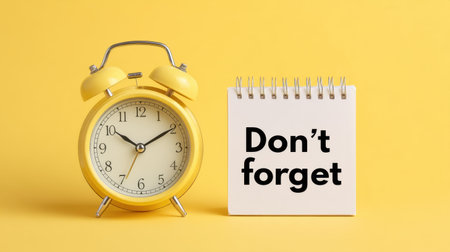 A vibrant composition featuring a yellow alarm clock and a note that says Don't forget, serving as a visual reminder of the significance of time management and planning.