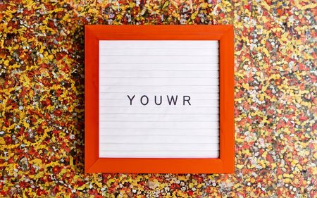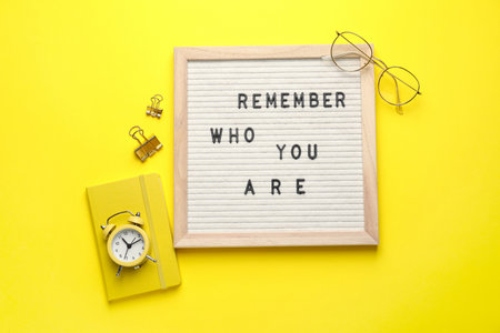 Flat lay composition of letter board with phrase Remember Who You Are on yellow background
