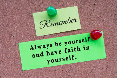 Motivational quote on stick note and pinned to a cork notice board - Remember always be yourself and have faith in yourself.