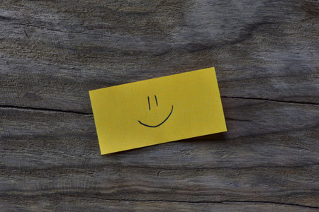 Smiley face on yellow sticky note on wooden board textured background. A pen draw smiley face on note paper.