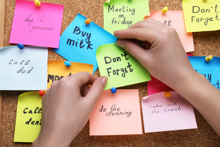 Woman pinning paper note with phrase Don't Forget to cork board, closeup
