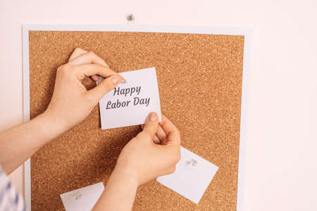 Womans hands hanging sticker with the inscription happy labor day