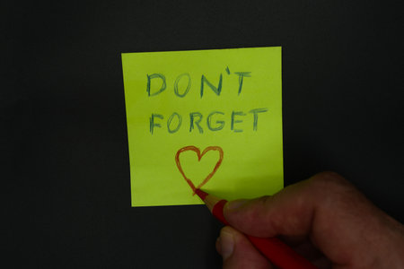 A yellow note with a reminder rests on an old, textured surface.