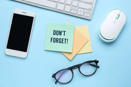 Smartphone, computer, paper with text DON'T FORGET and glasses on light blue background