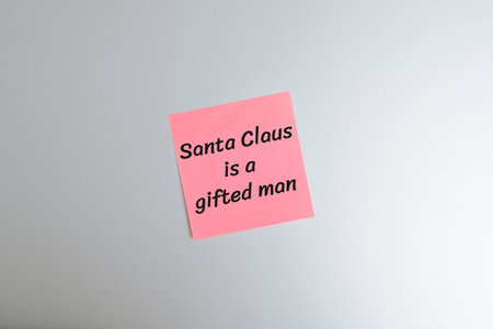 Funny Christmas phrase message on memo sticker Santa Claus is gifted man pasted on gray surface of refrigerator, close-up.