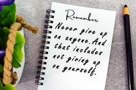 Motivational and inspirational quote on notepad with potted plant background.