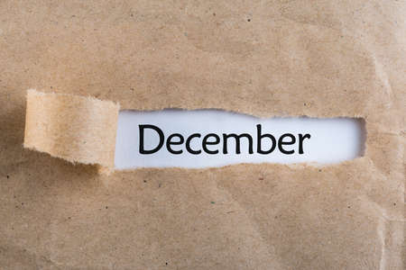 December - message appearing behind ripped brown paper. Winter, christmas and new year time