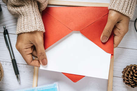 Woman open and look at thank you card or note inside a brown envelope. Close up view.