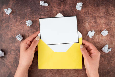 Hands Of Businesswoman Holding Blank Sheet And Envelope Surrounded With Crumpled Papers Over Wood. Woman With Letter Showing Crucial Message. Empty Space For Advertising.