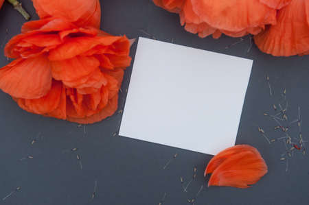 Overhead shot of mock-up greeting card with grey envelope on dark office desk with digital camera and office supplies
