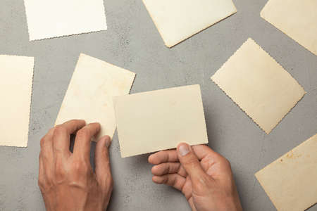 Old photo in the hands of man. Empty template for picture, mock-up. Gray background.