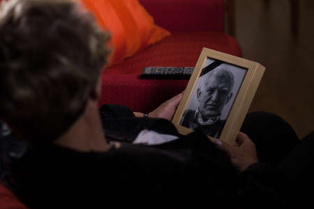 Portrait of elderly widow mourning dead close person