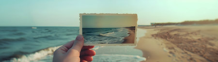 The image depicts a nostalgic summer beach scene captured in a slightly faded and worn photograph The photograph is being held in a person s hands conveying a sense of reminiscence and contemplation