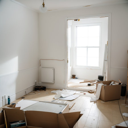 Room interior showing construction and home improvement project, with unfinished walls, plaster dust, scattered wood planks, paint cans, and sunlight on the floor, ready for completion