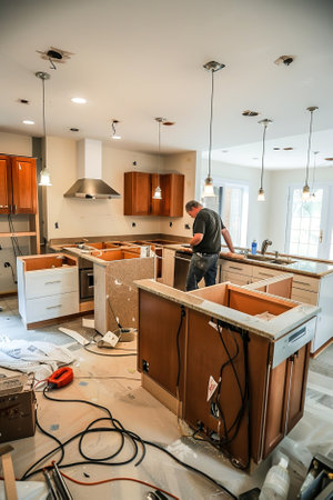Home renovation: A contractor and his team renovating a kitchen, installing new countertops and appliances.